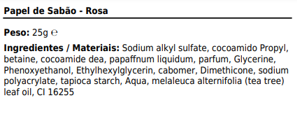 Papel de Sabão - Rosa 2,95 € Desconto de %. IVA incluído. Partilhar O produto encontra-se sem stock. Tamanho do recipiente: 76x64x10mm; Caixa de exposição: 160x135x62mm Tags papel de sabãorosa Características